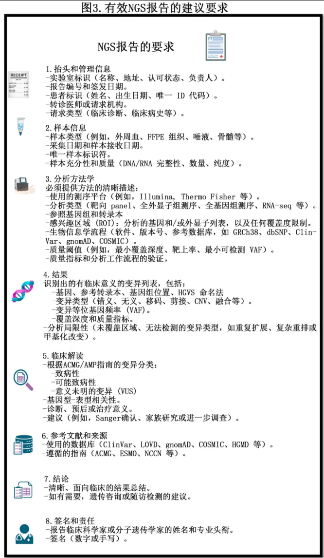在 NGS 分析过程结束时,必须准备一份全面的报告来总结结果。这份报告应该详尽,提供所用方法的必要技术细节,同时让非专业医疗保健专业人员和患者能够理解,并且足够简洁,避免用过多信息使读者不知所措。报告必须包括执行分析的实验室信息、患者的个人信息、样本的可追溯性、解决的临床问题、识别的变异及其解读,以及分析所采用的方法。