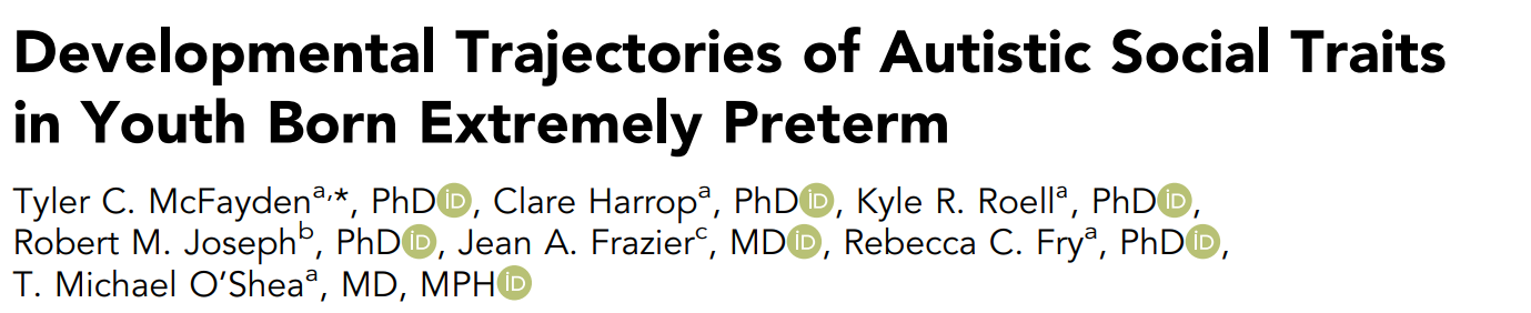 McFayden TC, Harrop C, Roell KR, et al. Developmental Trajectories of Autistic Social Traits in Youth Born Extremely Preterm. J Am Acad Child Adolesc Psychiatry. Published online December 2, 2025. doi:10.1016/j.jaac.2025.11.016
