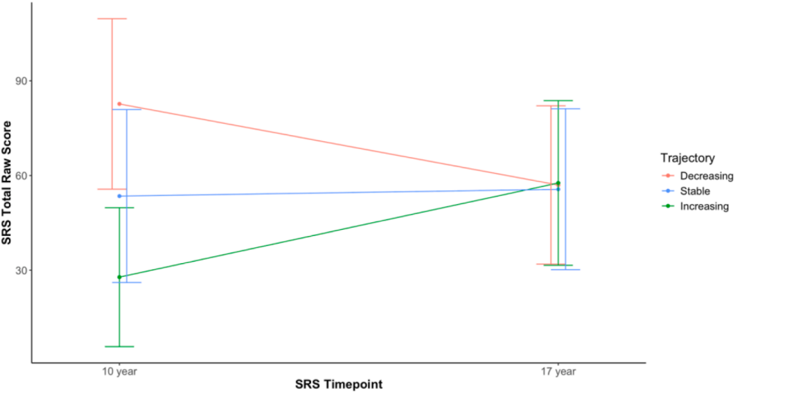 图:10至17岁期间社交反应量表(SRS)轨迹分组(上升型、稳定型、下降型)
