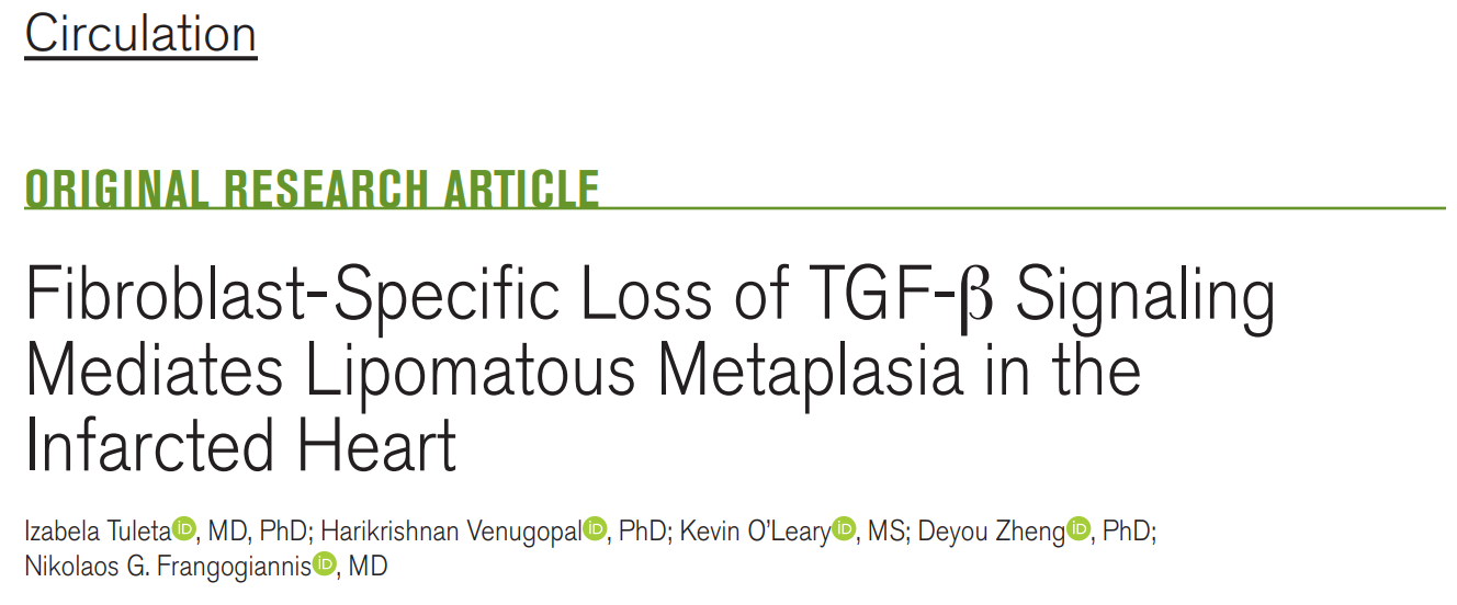 Izabela Tuleta , MD, PhD; Harikrishnan Venugopal , PhD; Kevin O’Leary , MS; Deyou Zheng , PhD;Nikolaos G. Frangogiannis , MD.Fibroblast-Specific Loss of TGF-β Signaling Mediates Lipomatous Metaplasia in the Infarcted Heart.Circulation. 2025;152:00–00. DOI: 10.1161/CIRCULATIONAHA.125.075676
