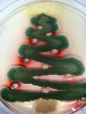 圣诞节了,在这寒冷的冬天里面,微生物也可以用来画出美丽的圣诞树呢,小小的菌落,竟然可以勾勒出如此绚丽多彩的图片。