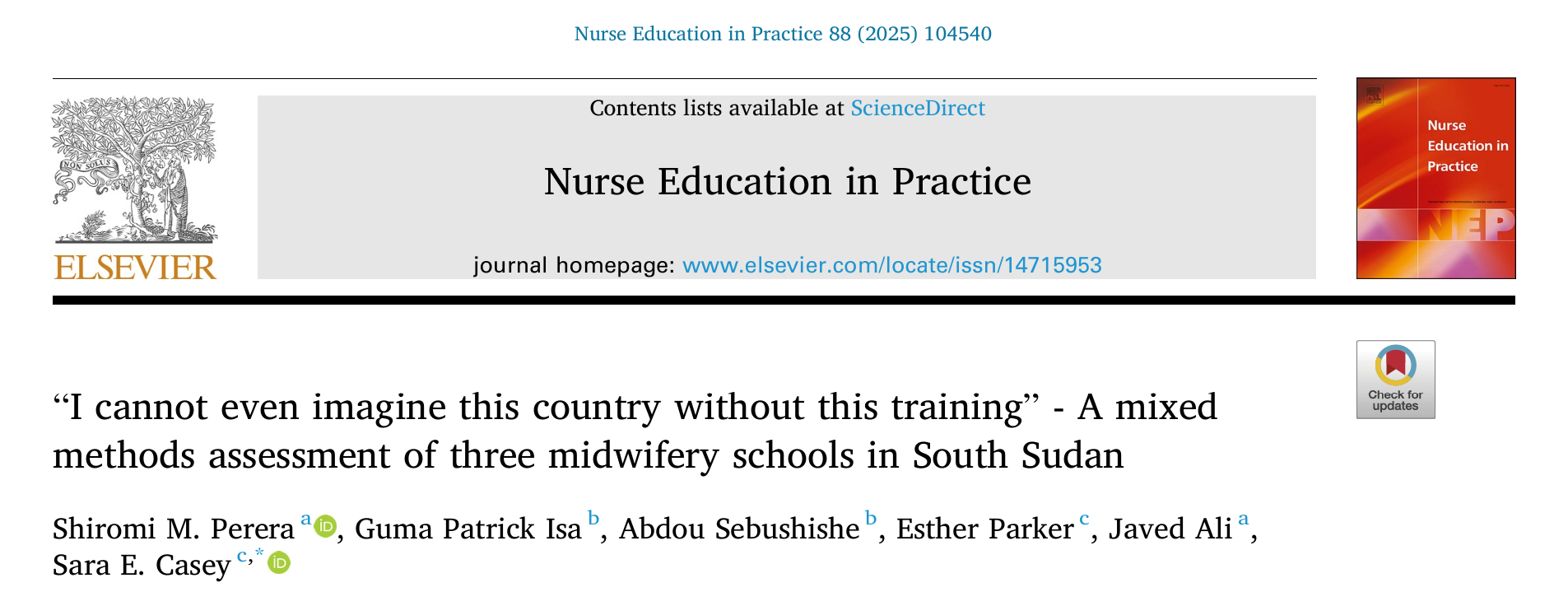 Perera, S. M., Isa, G. P., Sebushishe, A., Parker, E., Ali, J., & Casey, S. E. (2025). “I cannot even imagine this country without this training” - A mixed methods assessment of three midwifery schools in South Sudan. Nurse Education in Practice, 88, 104540. https://doi.org/10.1016/j.nepr.2025.104540