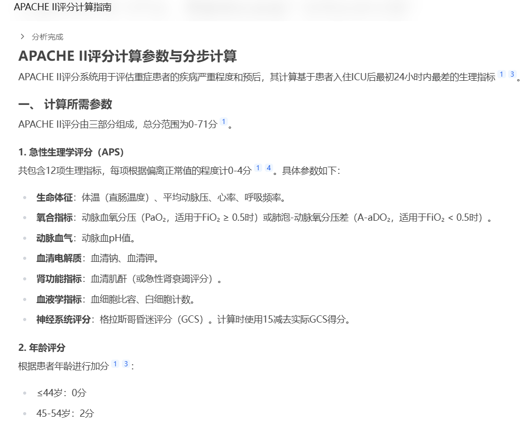 让我们一起来体验一下,打开工具输入:“计算APACHE II评分,需要哪些参数?如何分步计算?”