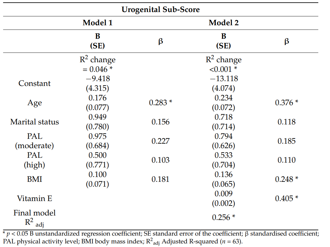 通过控制年龄、BMI、体力活动和婚姻状况等协变量后进行分层多元回归分析,研究者试图寻找营养素摄入对症状严重程度的预测作用。出乎意料的是,在众多被测营养素中,仅维生素E的摄入与泌尿生殖系统症状亚评分呈独立正相关(β=0.405, p<0.001),即摄入量越高,该领域症状评分也越高。这一发现与既往认为维生素E可能缓解血管舒缩症状的部分研究相左。作者对此提供了一个合理的解释:本研究中高达75%的参与者服用了含维生素E的各类补充剂(如复合维生素、月见草油等),而症状更严重的女性可能更倾向于寻求和采用补充疗法,从而导致了这种观察到的关联,而非因果效应。除此之外,研究中未发现其他营养素(包括饱受关注的钙、维生素D、膳食纤维、饱和脂肪等)与整体症状或各亚评分之间存在显著统计学关联。